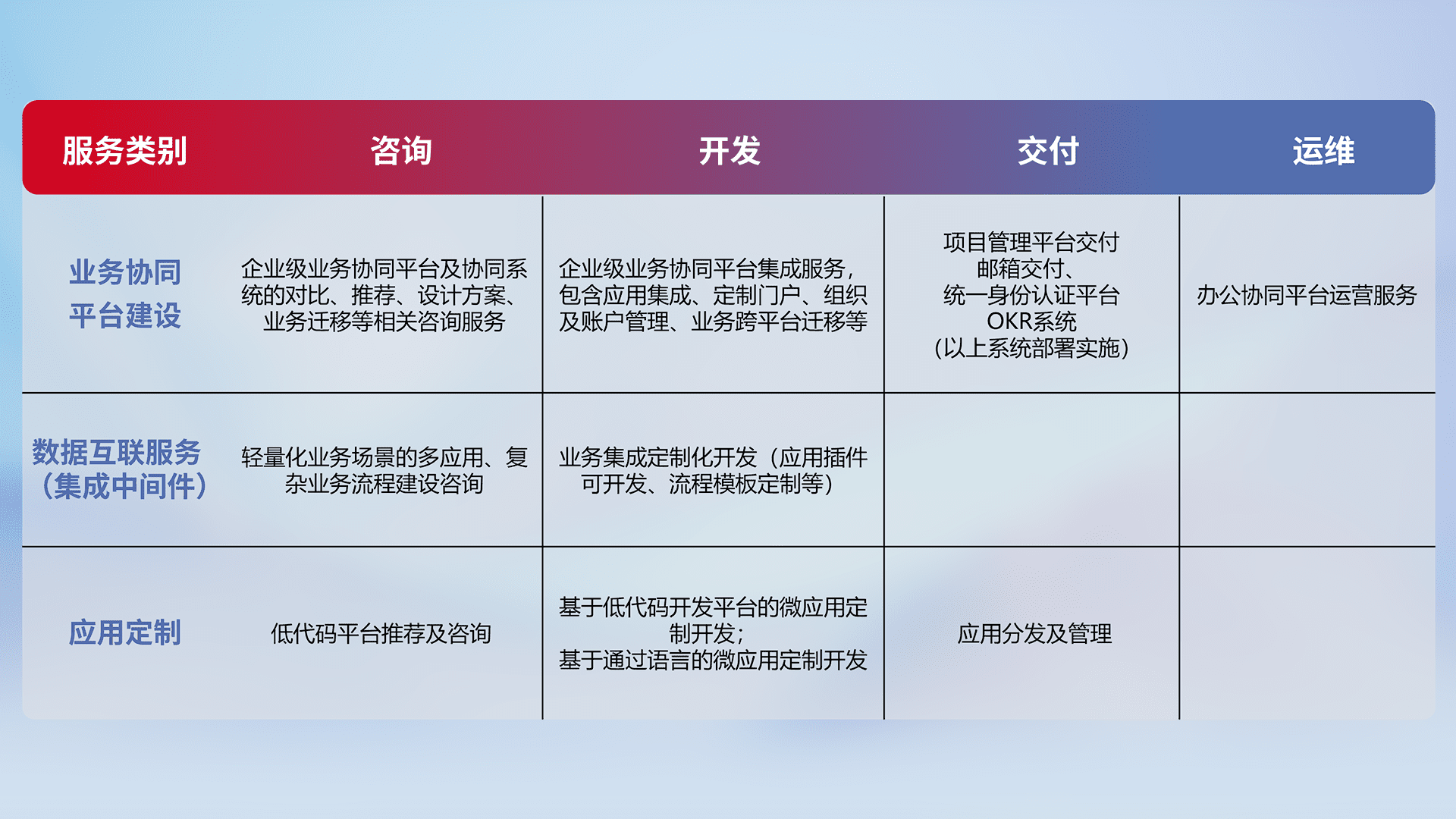 针对钉钉、、企微、、、IDaas等平台级产品提供产品的规划、、、方案、、交付、、、、定制化开发等服务,,实现如统一协同办公、、、智能客户服务、、、、混合会议管理、、、、智能数据查询、、、等业务场景,,,,实现数字化转型。。。